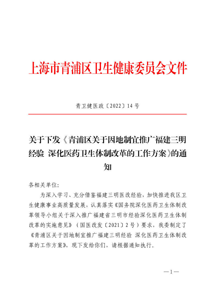 ??為深入學(xué)習(xí)、充分借鑒福建三明醫(yī)改經(jīng)驗(yàn),加快推進(jìn)我區(qū)衛(wèi)生健康事業(yè)高質(zhì)量發(fā)展,認(rèn)真落實(shí)《國(guó)務(wù)院深化醫(yī)藥衛(wèi)生體制改革領(lǐng)導(dǎo)小組關(guān)于深入推廣福建省三明市經(jīng)驗(yàn)深化醫(yī)藥衛(wèi)生體制改革的實(shí)施意見》(國(guó)醫(yī)改發(fā)〔2021〕2 號(hào))要求,我委制定了《青浦區(qū)關(guān)于因地制宜推廣福建三明經(jīng)驗(yàn)深化醫(yī)藥衛(wèi)生體制改革的工作方案》,現(xiàn)下發(fā)給你們,請(qǐng)根據(jù)通知執(zhí)行。