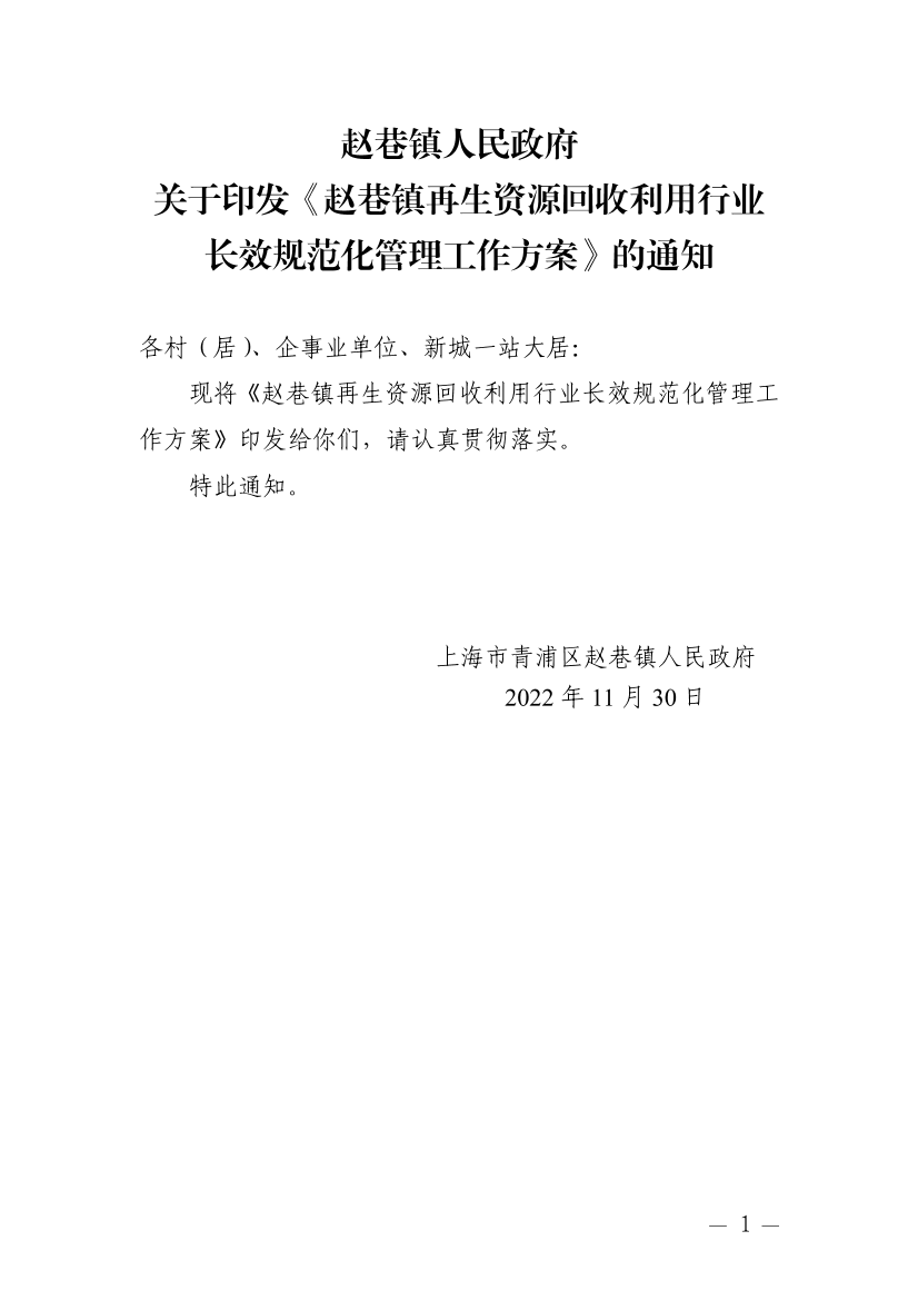 趙巷鎮(zhèn)人民政府關(guān)于印發(fā)《趙巷鎮(zhèn)再生資源回收利用行業(yè)長(zhǎng)效規(guī)范化管理工作方案》的通知