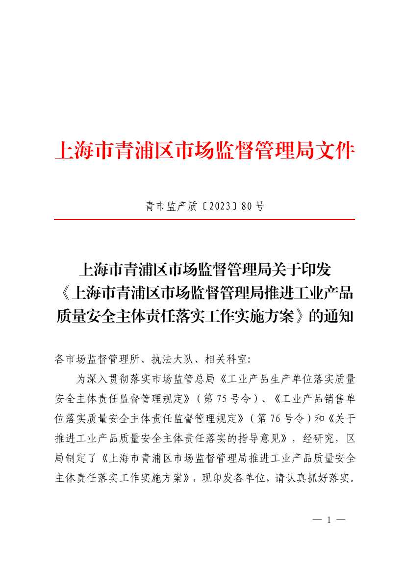 上海市青浦區(qū)市場(chǎng)監(jiān)督管理局推進(jìn)工業(yè)產(chǎn)品質(zhì)量安全主體責(zé)任落實(shí)工作實(shí)施方案