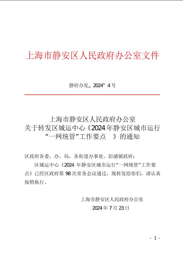 關于轉(zhuǎn)發(fā)區(qū)城運中心《2024年靜安區(qū)城市運行“一網(wǎng)統(tǒng)管”工作要點》的通知