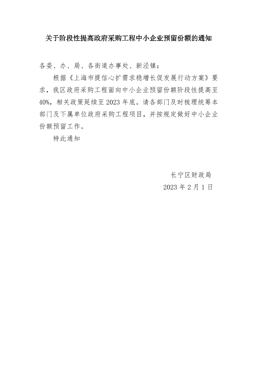 ??根據(jù)《上海市提信心擴(kuò)需求穩(wěn)增長促發(fā)展行動(dòng)方案》要求,我區(qū)政府采購工程面向中小企業(yè)預(yù)留份額階段性提高至40%,相關(guān)政策延續(xù)至2023年底。請(qǐng)各部門及時(shí)梳理統(tǒng)籌本部門及下屬單位政府采購工程項(xiàng)目,并按規(guī)定做好中小企業(yè)份額預(yù)留工作。