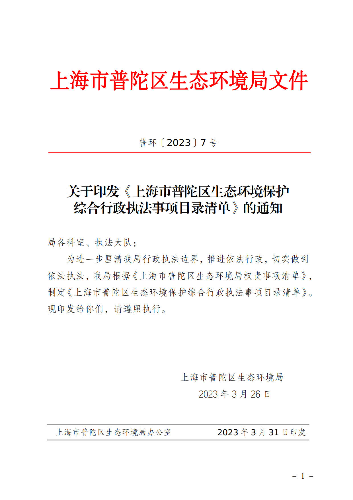 為進(jìn)一步厘清我局行政執(zhí)法邊界,推進(jìn)依法行政,切實(shí)做到依法執(zhí)法,我局根據(jù)《上海市普陀區(qū)生態(tài)環(huán)境局權(quán)責(zé)事項(xiàng)清單》,制定《上海市普陀區(qū)生態(tài)環(huán)境保護(hù)綜合行政執(zhí)法事項(xiàng)目錄清單》?,F(xiàn)印發(fā)給你們,請(qǐng)遵照?qǐng)?zhí)行。