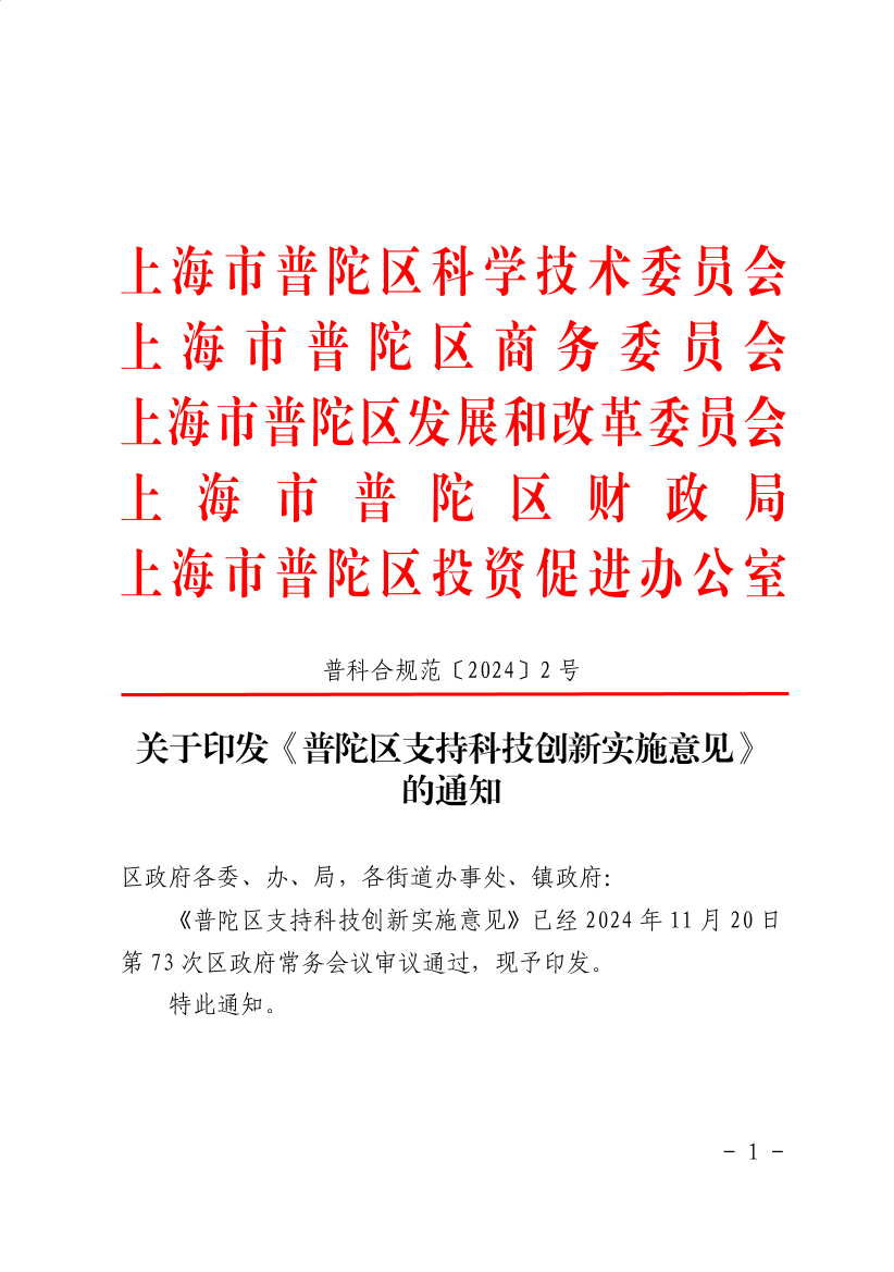 ??《普陀區(qū)支持科技創(chuàng)新實施意見》已經(jīng)2024年11月20日第73次區(qū)政府常務(wù)會議審議通過,現(xiàn)予印發(fā)。