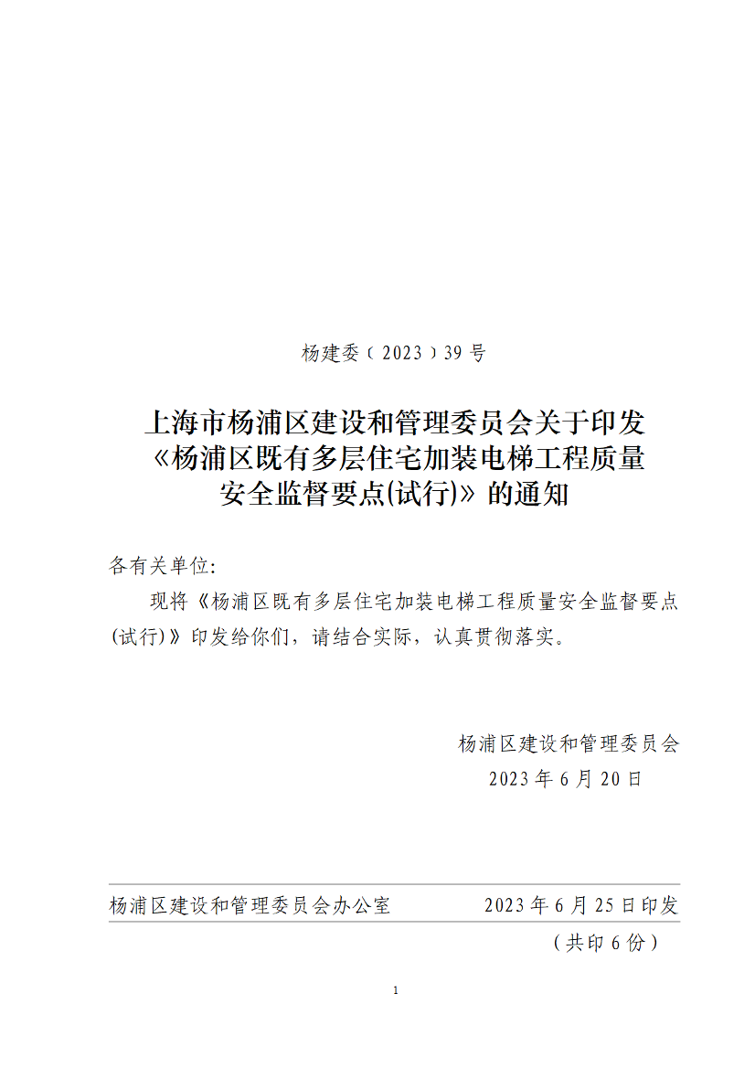 上海市楊浦區(qū)建設和管理委員會關于印發(fā)《楊浦區(qū)既有多層住宅加裝電梯工程質量安全監(jiān)督要點(試行)》的通知