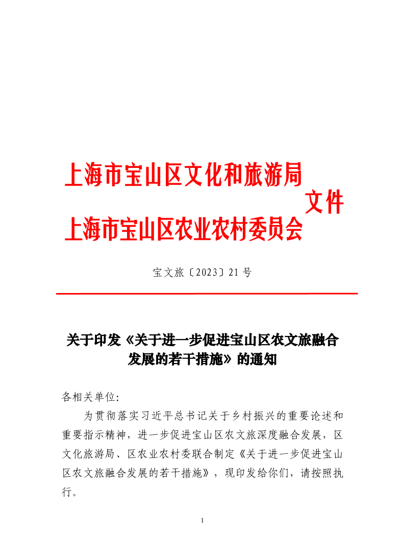關(guān)于印發(fā)《關(guān)于進(jìn)一步促進(jìn)寶山區(qū)農(nóng)文旅融合發(fā)展的若干措施》的通知