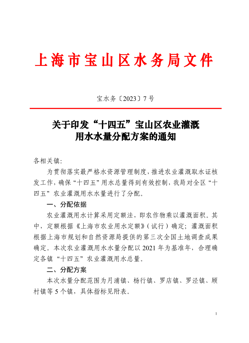 ??本次水量分配范圍為月浦鎮(zhèn)、楊行鎮(zhèn)、羅店鎮(zhèn)、羅涇鎮(zhèn)、顧村鎮(zhèn)等5個鎮(zhèn),具體指標(biāo)見附表。
