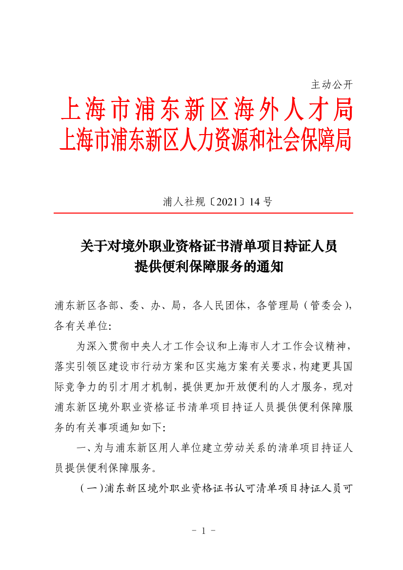 ??為深入貫徹中央人才工作會(huì)議和上海市人才工作會(huì)議精神,落實(shí)引領(lǐng)區(qū)建設(shè)市行動(dòng)方案和區(qū)實(shí)施方案有關(guān)要求,構(gòu)建更具國(guó)際競(jìng)爭(zhēng)力的引才用才機(jī)制,提供更加開放便利的人才服務(wù),現(xiàn)對(duì)浦東新區(qū)境外職業(yè)資格證書清單項(xiàng)目持證人員提供便利保障服務(wù)的有關(guān)事項(xiàng)通知如下: