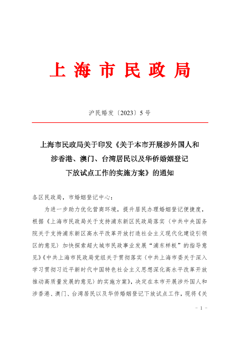 ??為進一步助力優(yōu)化營商環(huán)境,提升居民辦理婚姻登記便捷度,根據(jù)《上海市民政局關于支持浦東新區(qū)民政局落實〈中共中央國務院關于支持浦東新區(qū)高水平改革開放打造社會主義現(xiàn)代化建設引領區(qū)的意見〉加快探索超大城市民政事業(yè)發(fā)展“浦東樣板”的指導意見》《中共上海市民政局黨組關于貫徹落實〈中共上海市委關于深入學習貫徹習近平新時代中國特色社會主義思想深化高水平改革開放推動高質量發(fā)展的意見〉的實施方案》,決定在本市開展涉外國人和涉香港、澳門、臺灣居民以及華僑婚姻登記下放試點工作,現(xiàn)將《關于本市開展涉外國人和涉香港、澳門、臺灣居民以及華僑婚姻登記下放試點工作的實施方案》印發(fā)給你們,請認真貫徹執(zhí)行。