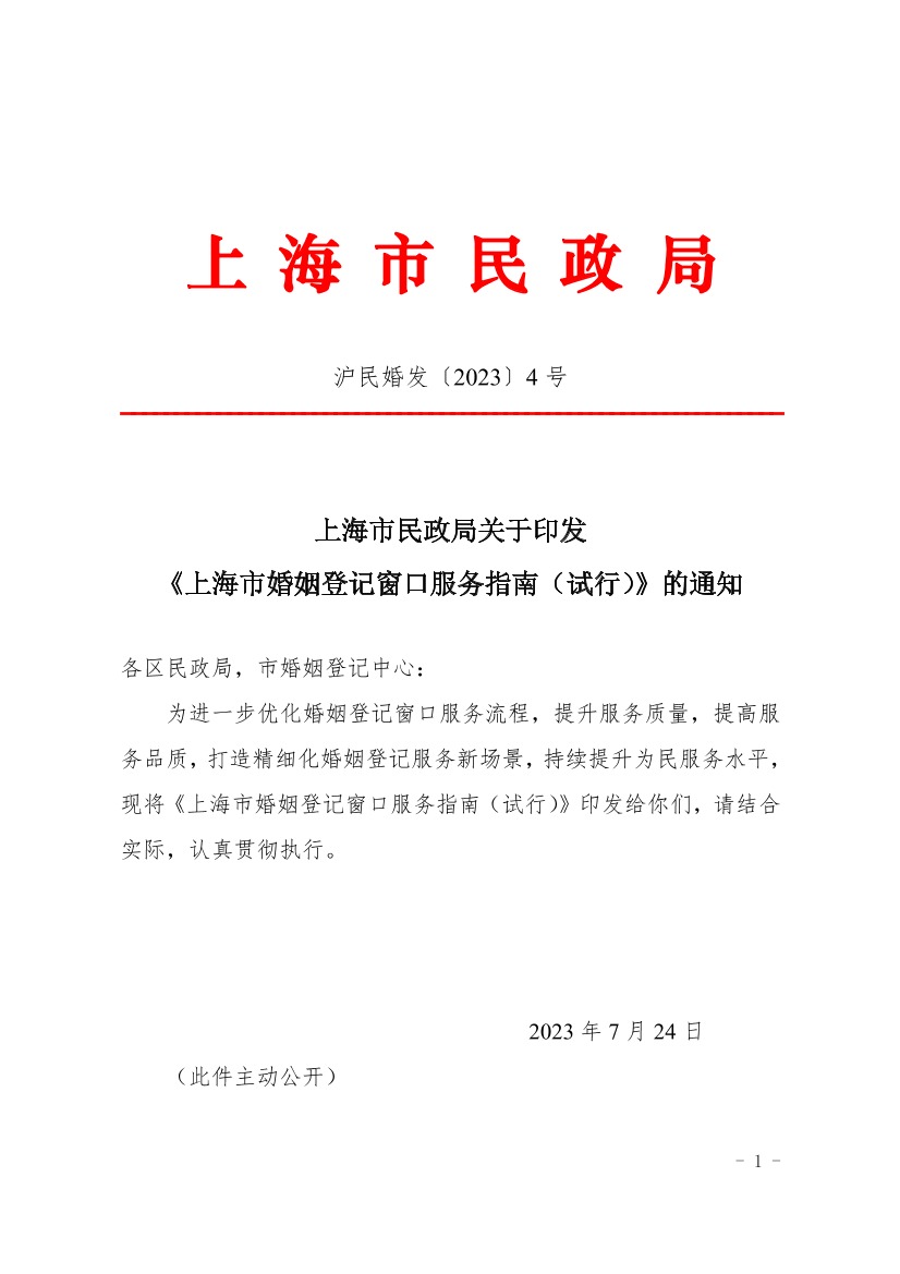 ??為進一步優(yōu)化婚姻登記窗口服務(wù)流程,提升服務(wù)質(zhì)量,提高服務(wù)品質(zhì),打造精細化婚姻登記服務(wù)新場景,持續(xù)提升為民服務(wù)水平,現(xiàn)將《上海市婚姻登記窗口服務(wù)指南(試行)》印發(fā)給你們,請結(jié)合實際,認真貫徹執(zhí)行。