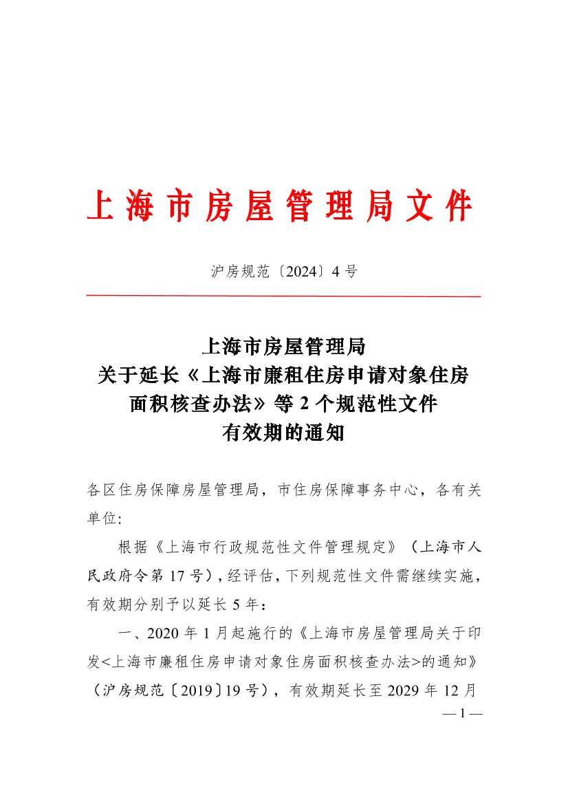 關(guān)于延長《上海市廉租住房申請對象住房面積核查辦法》等2個規(guī)范性文件有效期的通知
