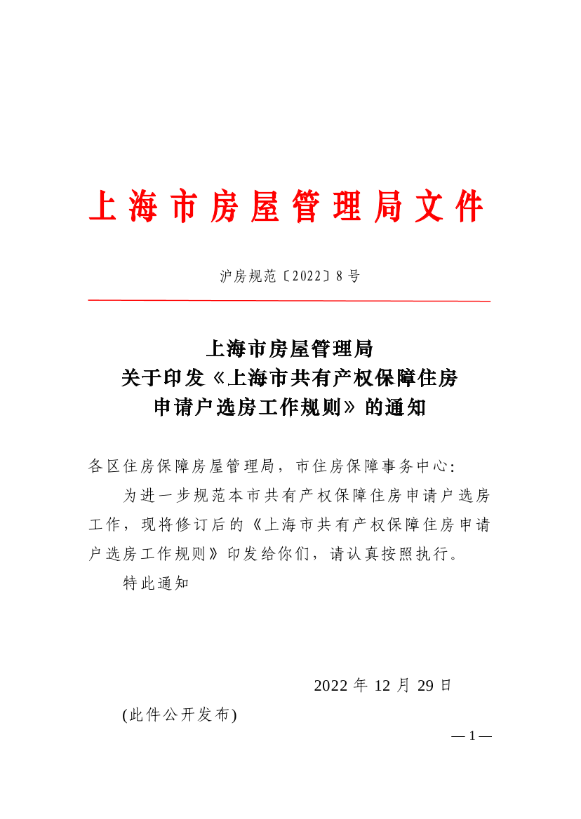 關(guān)于印發(fā)《上海市共有產(chǎn)權(quán)保障住房申請戶選房工作規(guī)則》的通知