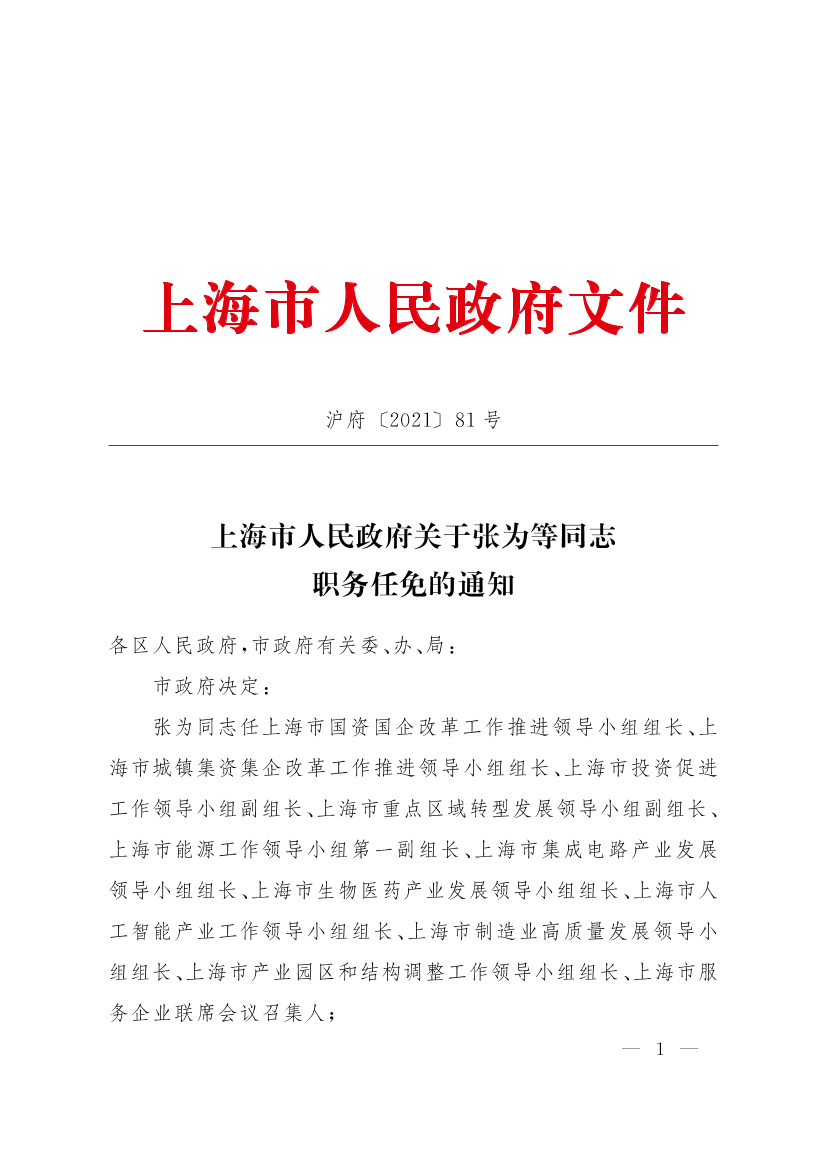 ??張為同志任上海市國資國企改革工作推進領(lǐng)導(dǎo)小組組長、上海市城鎮(zhèn)集資集企改革工作推進領(lǐng)導(dǎo)小組組長、上海市投資促進工作領(lǐng)導(dǎo)小組副組長、上海市重點區(qū)域轉(zhuǎn)型發(fā)展領(lǐng)導(dǎo)小組副組長、上海市能源工作領(lǐng)導(dǎo)小組第一副組長、上海市集成電路產(chǎn)業(yè)發(fā)展領(lǐng)導(dǎo)小組組長、上海市生物醫(yī)藥產(chǎn)業(yè)發(fā)展領(lǐng)導(dǎo)小組組長、上海市人工智能產(chǎn)業(yè)工作領(lǐng)導(dǎo)小組組長、上海市制造業(yè)高質(zhì)量發(fā)展領(lǐng)導(dǎo)小組組長、上海市產(chǎn)業(yè)園區(qū)和結(jié)構(gòu)調(diào)整工作領(lǐng)導(dǎo)小組組長、上海市服務(wù)企業(yè)聯(lián)席會議召集人;