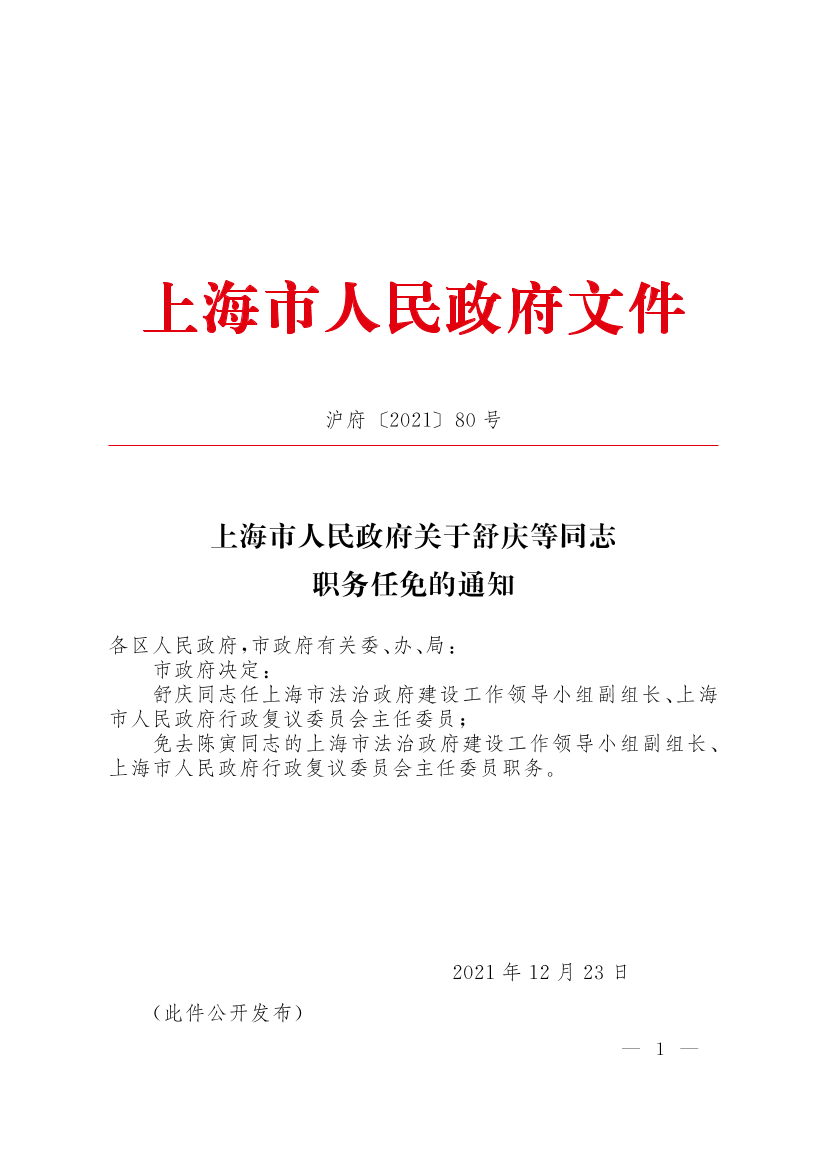 ??舒慶同志任上海市法治政府建設工作領導小組副組長、上海市人民政府行政復議委員會主任委員;