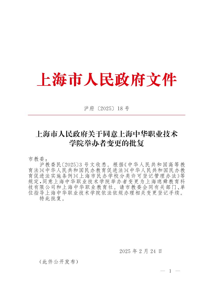 ??滬教委民〔2025〕3號文收悉。根據(jù)《中華人民共和國高等教育法》《中華人民共和國民辦教育促進法》《中華人民共和國民辦教育促進法實施條例》《上海市民辦學(xué)校分類許可登記管理辦法》等規(guī)定,同意上海中華職業(yè)技術(shù)學(xué)院舉辦者變更為上海璁舜教育科技有限公司和上海中華職業(yè)教育社。請市教委會同有關(guān)部門、單位指導(dǎo)上海中華職業(yè)技術(shù)學(xué)院依法依規(guī)辦理相關(guān)變更登記手續(xù)。