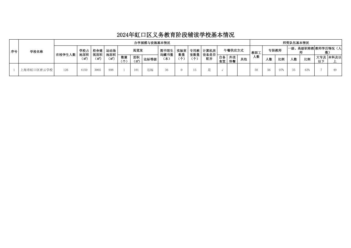 | 1 | 上海市虹口區(qū)密云學(xué)校 | 126 | 4159 | 3005 | 998 | 1 | 101 | 達標(biāo) | 36 | 0 | 15 | 是 | √ | 58 | 56 | 97% | 35 | 63% | 7 | 49 | ||