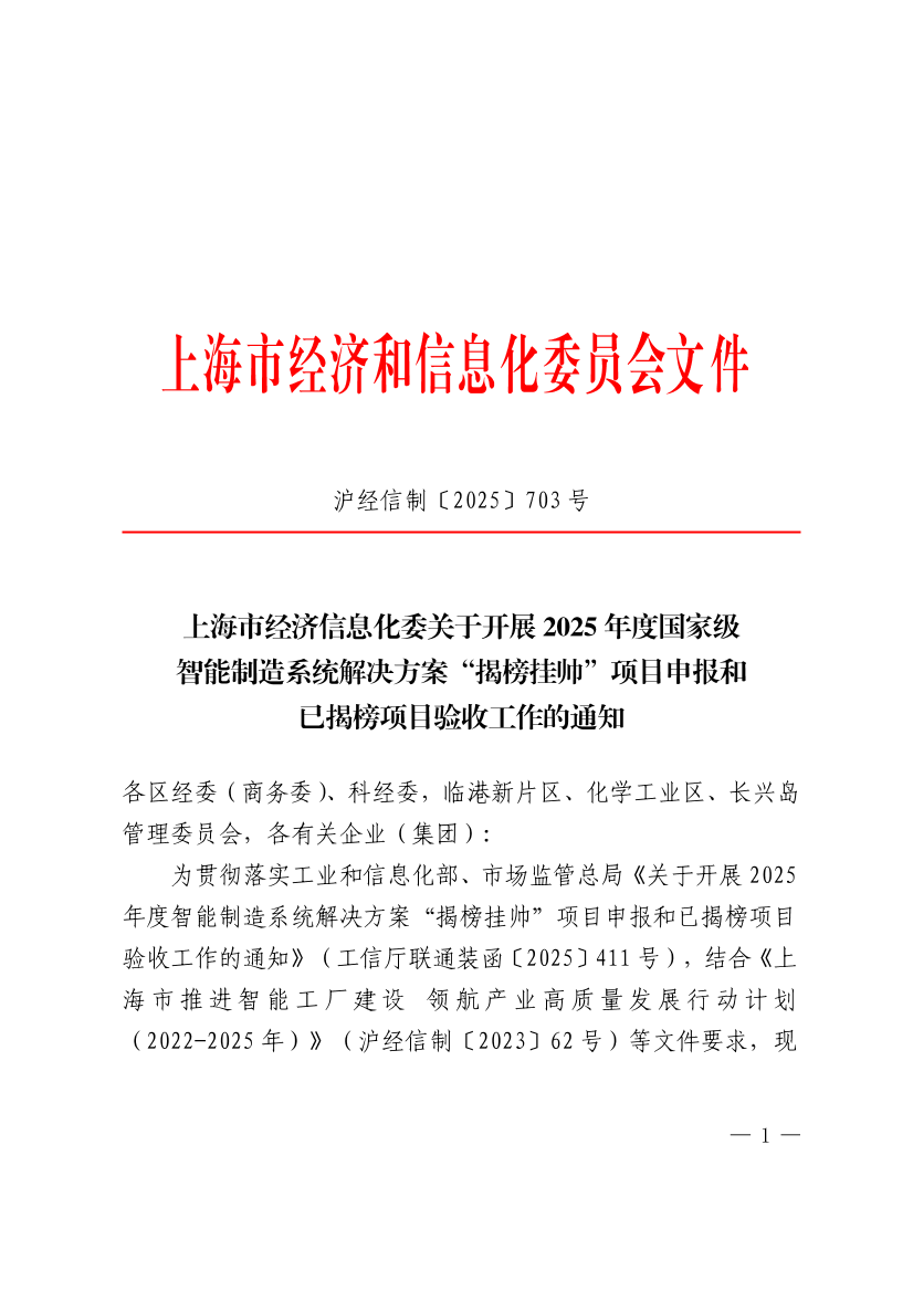 ??為貫徹落實(shí)工業(yè)和信息化部、市場監(jiān)管總局《關(guān)于開展2025年度智能制造系統(tǒng)解決方案“揭榜掛帥”項(xiàng)目申報(bào)和已揭榜項(xiàng)目驗(yàn)收工作的通知》(工信廳聯(lián)通裝函〔2025〕411號),結(jié)合《上海市推進(jìn)智能工廠建設(shè) 領(lǐng)航產(chǎn)業(yè)高質(zhì)量發(fā)展行動(dòng)計(jì)劃(2022-2025年)》(滬經(jīng)信制〔2023〕62號)等文件要求,現(xiàn)啟動(dòng)2025年度國家級智能制造系統(tǒng)解決方案“揭榜掛帥”項(xiàng)目申報(bào)和已揭榜項(xiàng)目驗(yàn)收工作,具體通知如下: