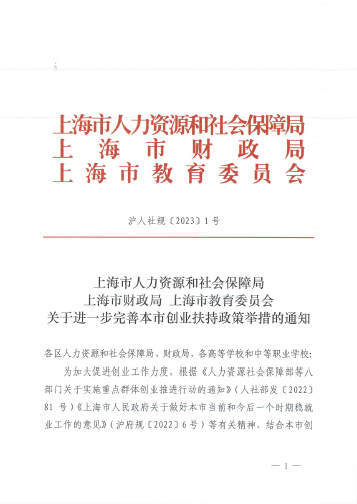 ??為加大促進創(chuàng)業(yè)工作力度,根據(jù)《人力資源社會保障部等八部門關(guān)于實施重點群體創(chuàng)業(yè)推進行動的通知》(人社部發(fā)〔2022〕81號)《上海市人民政府關(guān)于做好本市當(dāng)前和今后一個時期穩(wěn)就業(yè)工作的意見》(滬府規(guī)〔2022〕6號)等有關(guān)精神,結(jié)合本市創(chuàng)業(yè)工作實際,現(xiàn)就進一步完善本市創(chuàng)業(yè)扶持政策有關(guān)事項通知如下: