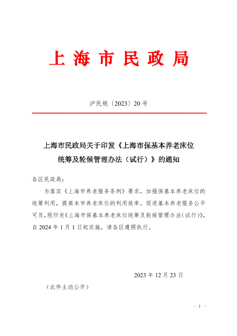 ??為落實(shí)《上海市養(yǎng)老服務(wù)條例》要求,加強(qiáng)?;攫B(yǎng)老床位的統(tǒng)籌利用,提高本市養(yǎng)老床位的利用效率,促進(jìn)基本養(yǎng)老服務(wù)公平可及,現(xiàn)印發(fā)《上海市保基本養(yǎng)老床位統(tǒng)籌及輪候管理辦法(試行)》,自2024年1月1日起實(shí)施,請(qǐng)各區(qū)遵照?qǐng)?zhí)行。