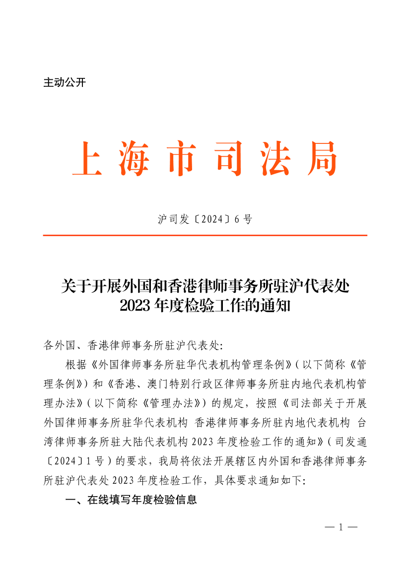 關(guān)于開展外國和香港律師事務(wù)所駐滬代表處2023年度檢驗(yàn)工作的通知