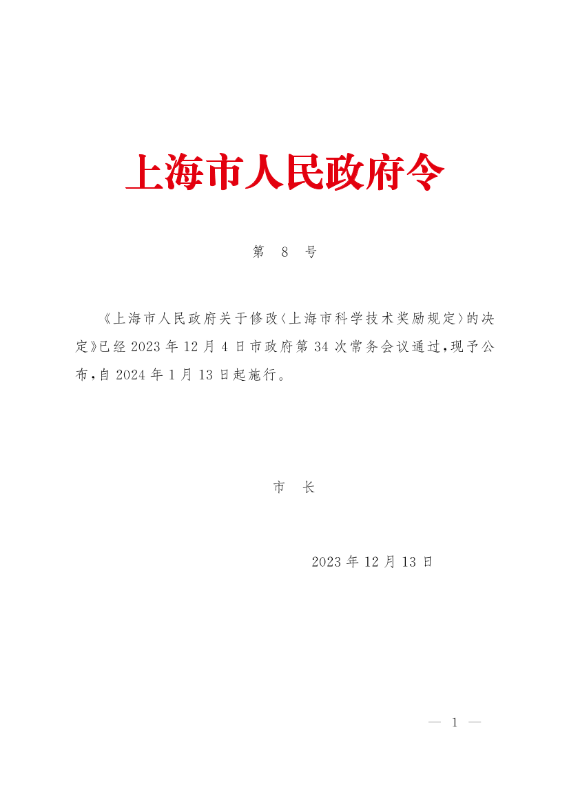 ??《上海市人民政府關(guān)于修改〈上海市科學(xué)技術(shù)獎勵規(guī)定〉的決定》已經(jīng)2023年12月4日市政府第34次常務(wù)會議通過,現(xiàn)予公布,自2024年1月13日起施行。