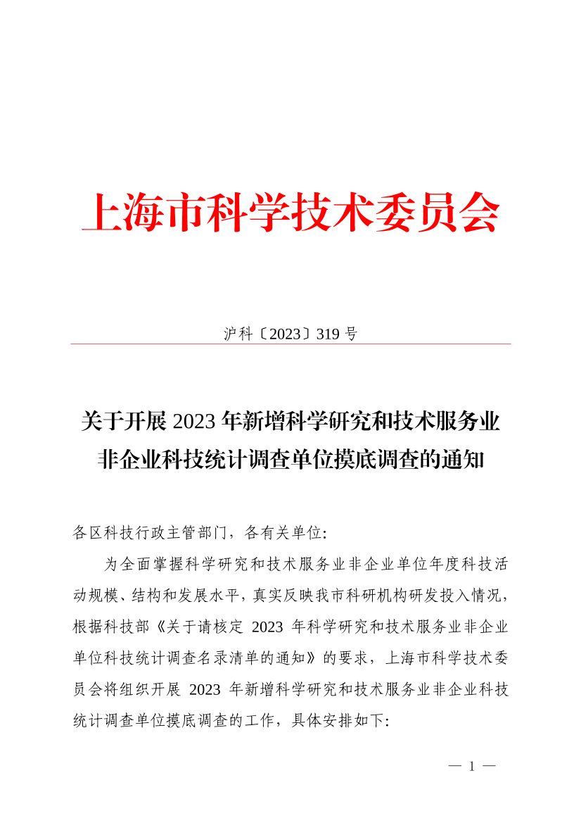 ??為全面掌握科學(xué)研究和技術(shù)服務(wù)業(yè)非企業(yè)單位年度科技活動規(guī)模、結(jié)構(gòu)和發(fā)展水平,真實反映我市科研機構(gòu)研發(fā)投入情況,根據(jù)科技部《關(guān)于請核定2023年科學(xué)研究和技術(shù)服務(wù)業(yè)非企業(yè)單位科技統(tǒng)計調(diào)查名錄清單的通知》的要求,上海市科學(xué)技術(shù)委員會將組織開展2023年新增科學(xué)研究和技術(shù)服務(wù)業(yè)非企業(yè)科技統(tǒng)計調(diào)查單位摸底調(diào)查的工作,具體安排如下: