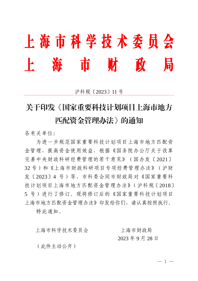 ??為進(jìn)一步規(guī)范國家重要科技計(jì)劃項(xiàng)目上海市地方匹配資金管理,提高資金使用效益,根據(jù)《國務(wù)院辦公廳關(guān)于改革完善中央財(cái)政科研經(jīng)費(fèi)管理的若干意見》(國辦發(fā)〔2021〕32號(hào))和《上海市財(cái)政科研項(xiàng)目專項(xiàng)經(jīng)費(fèi)管理辦法》(滬財(cái)發(fā)〔2023〕4號(hào))等,市科委會(huì)同市財(cái)政局對(duì)《國家重要科技計(jì)劃項(xiàng)目上海市地方匹配資金管理辦法》(滬科規(guī)〔2018〕5號(hào))進(jìn)行了修訂。現(xiàn)將修訂后的《國家重要科技計(jì)劃項(xiàng)目上海市地方匹配資金管理辦法》印發(fā)給你們,請認(rèn)真按照執(zhí)行。
