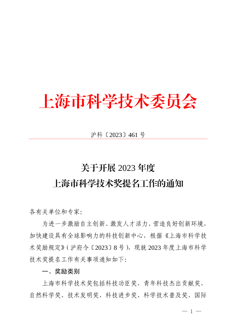 關(guān)于開展2023年度上海市科學(xué)技術(shù)獎(jiǎng)提名工作的通知