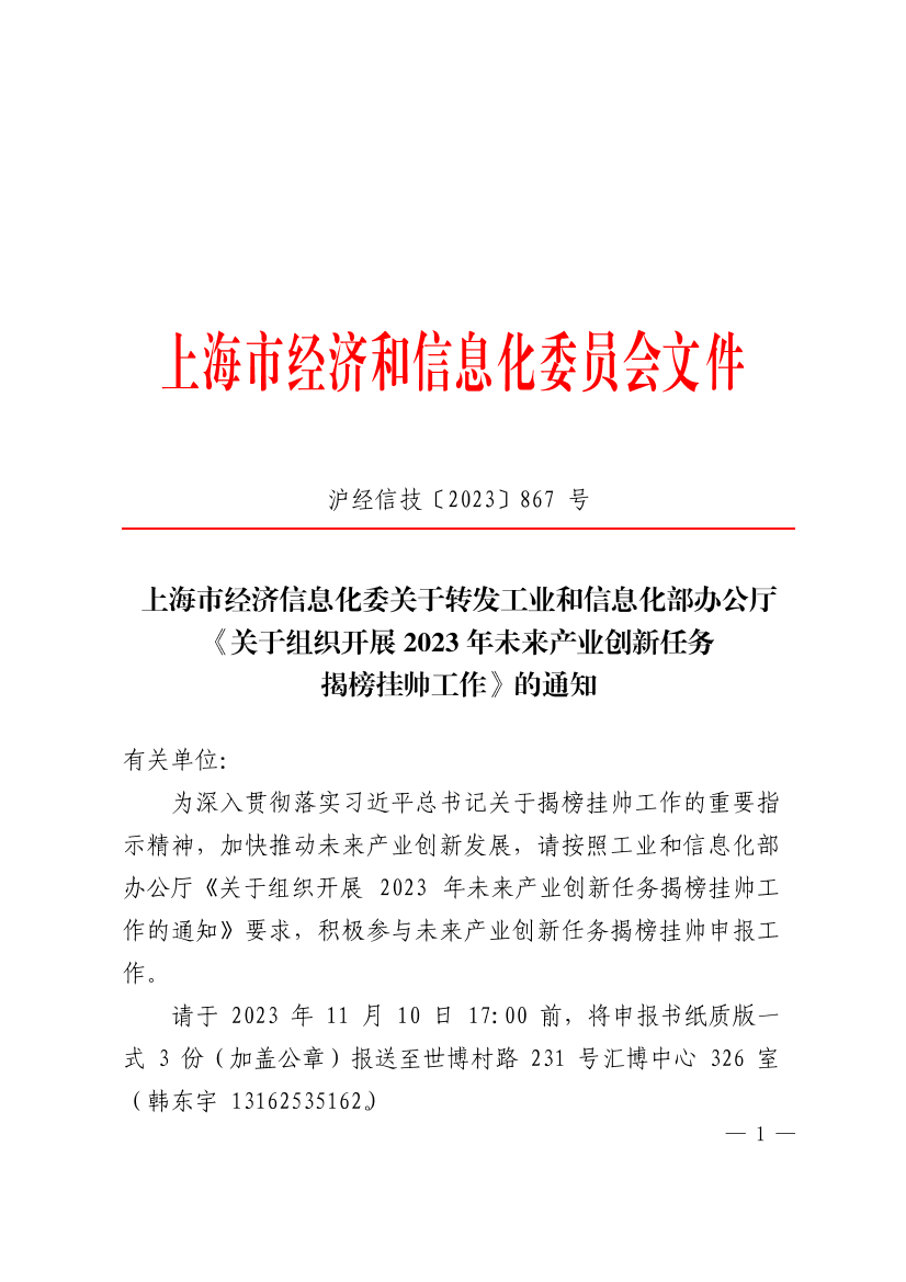 ??請于2023年11月10日17:00前,將申報書紙質版一式3份(加蓋公章)報送至世博村路231號匯博中心326室(韓東宇13162535162)。