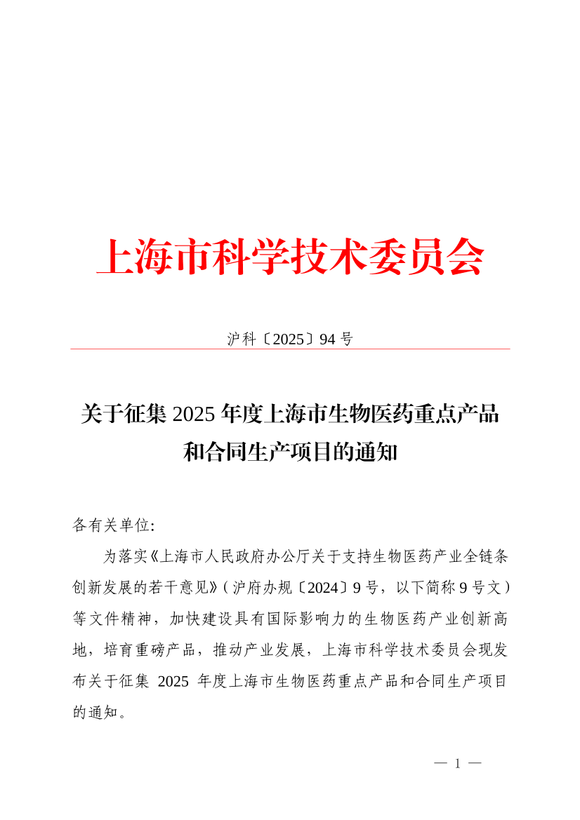 ??為落實(shí)《上海市人民政府辦公廳關(guān)于支持生物醫(yī)藥產(chǎn)業(yè)全鏈條創(chuàng)新發(fā)展的若干意見》(滬府辦規(guī)〔2024〕9號(hào),以下簡(jiǎn)稱9號(hào)文)等文件精神,加快建設(shè)具有國(guó)際影響力的生物醫(yī)藥產(chǎn)業(yè)創(chuàng)新高地,培育重磅產(chǎn)品,推動(dòng)產(chǎn)業(yè)發(fā)展,上海市科學(xué)技術(shù)委員會(huì)現(xiàn)發(fā)布關(guān)于征集2025年度上海市生物醫(yī)藥重點(diǎn)產(chǎn)品和合同生產(chǎn)項(xiàng)目的通知。