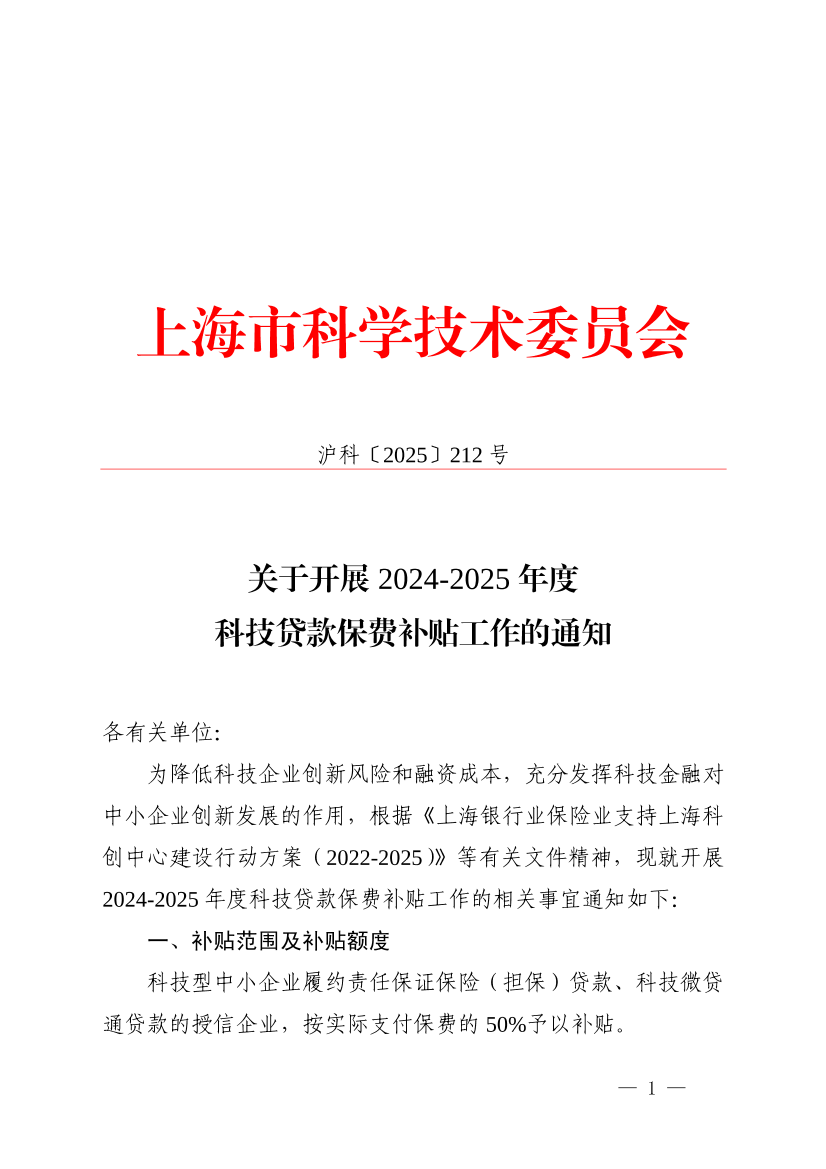 ??為降低科技企業(yè)創(chuàng)新風險和融資成本,充分發(fā)揮科技金融對中小企業(yè)創(chuàng)新發(fā)展的作用,根據(jù)《上海銀行業(yè)保險業(yè)支持上??苿?chuàng)中心建設(shè)行動方案(2022-2025)》等有關(guān)文件精神,現(xiàn)就開展2024-2025年度科技貸款保費補貼工作的相關(guān)事宜通知如下: