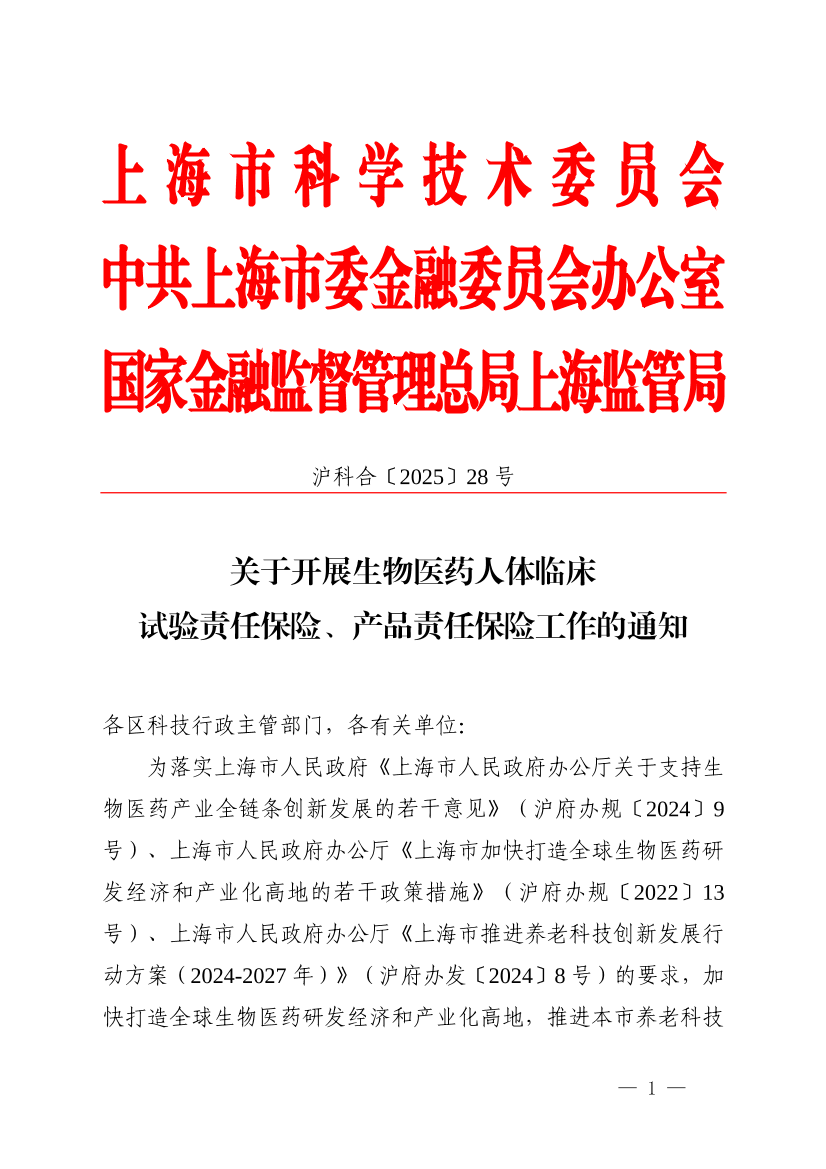 ??為落實(shí)上海市人民政府《上海市人民政府辦公廳關(guān)于支持生物醫(yī)藥產(chǎn)業(yè)全鏈條創(chuàng)新發(fā)展的若干意見(jiàn)》(滬府辦規(guī)〔2024〕9號(hào))、上海市人民政府辦公廳《上海市加快打造全球生物醫(yī)藥研發(fā)經(jīng)濟(jì)和產(chǎn)業(yè)化高地的若干政策措施》(滬府辦規(guī)〔2022〕13號(hào))、上海市人民政府辦公廳《上海市推進(jìn)養(yǎng)老科技創(chuàng)新發(fā)展行動(dòng)方案(2024-2027年)》(滬府辦發(fā)〔2024〕8號(hào))的要求,加快打造全球生物醫(yī)藥研發(fā)經(jīng)濟(jì)和產(chǎn)業(yè)化高地,推進(jìn)本市養(yǎng)老科技創(chuàng)新發(fā)展,培育發(fā)展新動(dòng)能,針對(duì)生物醫(yī)藥產(chǎn)品、養(yǎng)老科技產(chǎn)品投保人體臨床試驗(yàn)責(zé)任保險(xiǎn)、產(chǎn)品責(zé)任保險(xiǎn)建立保費(fèi)補(bǔ)貼機(jī)制,現(xiàn)就相關(guān)工作通知如下: