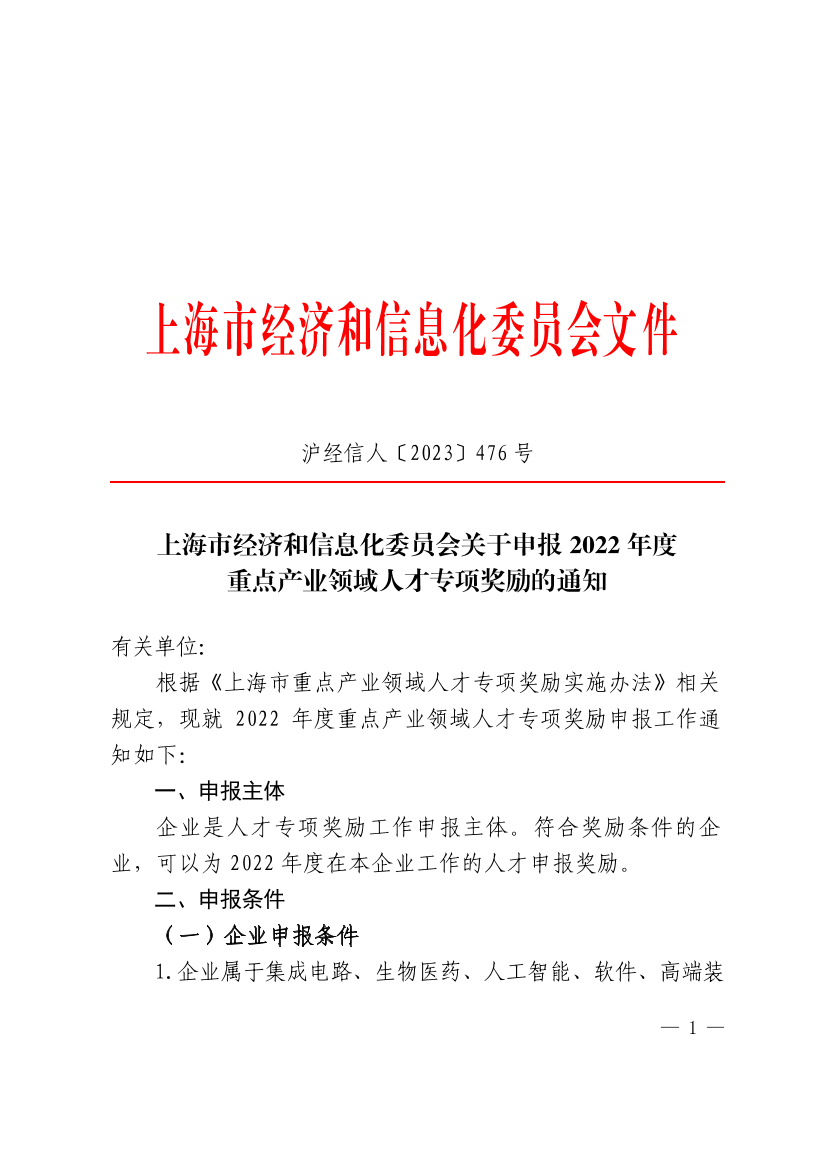 ??根據(jù)《上海市重點(diǎn)產(chǎn)業(yè)領(lǐng)域人才專項(xiàng)獎(jiǎng)勵(lì)實(shí)施辦法》相關(guān)規(guī)定,現(xiàn)就2022年度重點(diǎn)產(chǎn)業(yè)領(lǐng)域人才專項(xiàng)獎(jiǎng)勵(lì)申報(bào)工作通知如下: