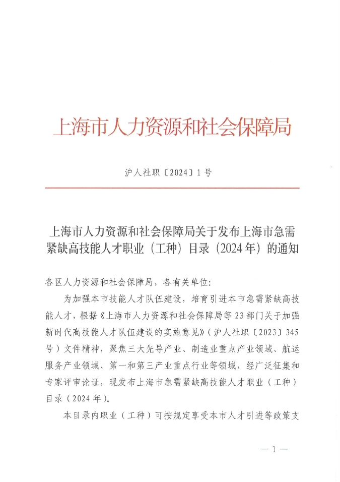 ??為加強(qiáng)本市技能人才隊(duì)伍建設(shè),培育引進(jìn)本市急需緊缺高技能人才,根據(jù)《上海市人力資源和社會(huì)保障局等23部門關(guān)于加強(qiáng)新時(shí)代高技能人才隊(duì)伍建設(shè)的實(shí)施意見》(滬人社職〔2023〕345號(hào))文件精神,聚焦三大先導(dǎo)產(chǎn)業(yè)、制造業(yè)重點(diǎn)產(chǎn)業(yè)領(lǐng)域、航運(yùn)服務(wù)產(chǎn)業(yè)領(lǐng)域、第一和第三產(chǎn)業(yè)重點(diǎn)行業(yè)等領(lǐng)域,經(jīng)廣泛征集和專家評(píng)審論證,現(xiàn)發(fā)布上海市急需緊缺高技能人才職業(yè)(工種)目錄(2024年)。