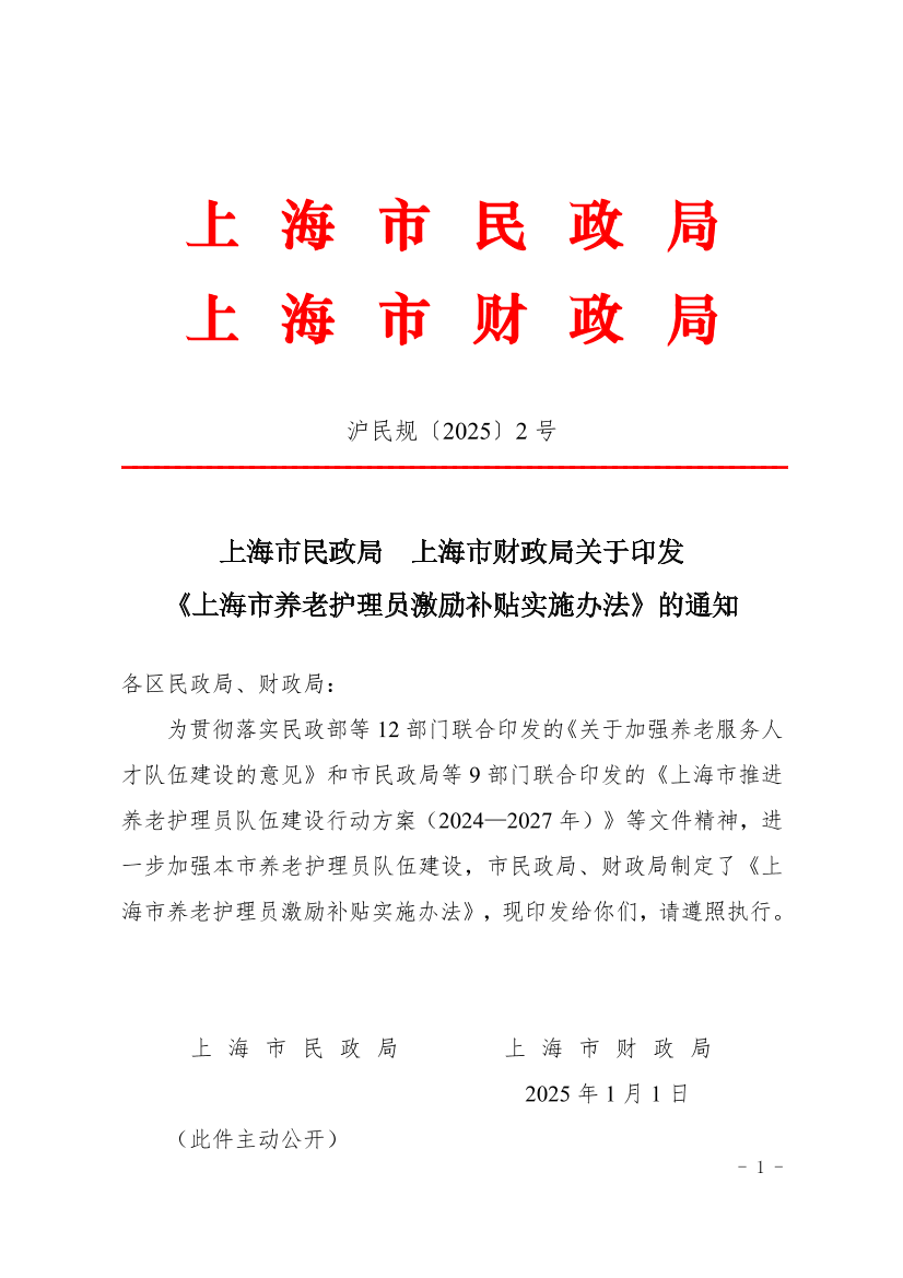 ??為貫徹落實(shí)民政部等12部門聯(lián)合印發(fā)的《關(guān)于加強(qiáng)養(yǎng)老服務(wù)人才隊(duì)伍建設(shè)的意見(jiàn)》和市民政局等9部門聯(lián)合印發(fā)的《上海市推進(jìn)養(yǎng)老護(hù)理員隊(duì)伍建設(shè)行動(dòng)方案(2024—2027年)》等文件精神,進(jìn)一步加強(qiáng)本市養(yǎng)老護(hù)理員隊(duì)伍建設(shè),市民政局、財(cái)政局制定了《上海市養(yǎng)老護(hù)理員激勵(lì)補(bǔ)貼實(shí)施辦法》,現(xiàn)印發(fā)給你們,請(qǐng)遵照?qǐng)?zhí)行。