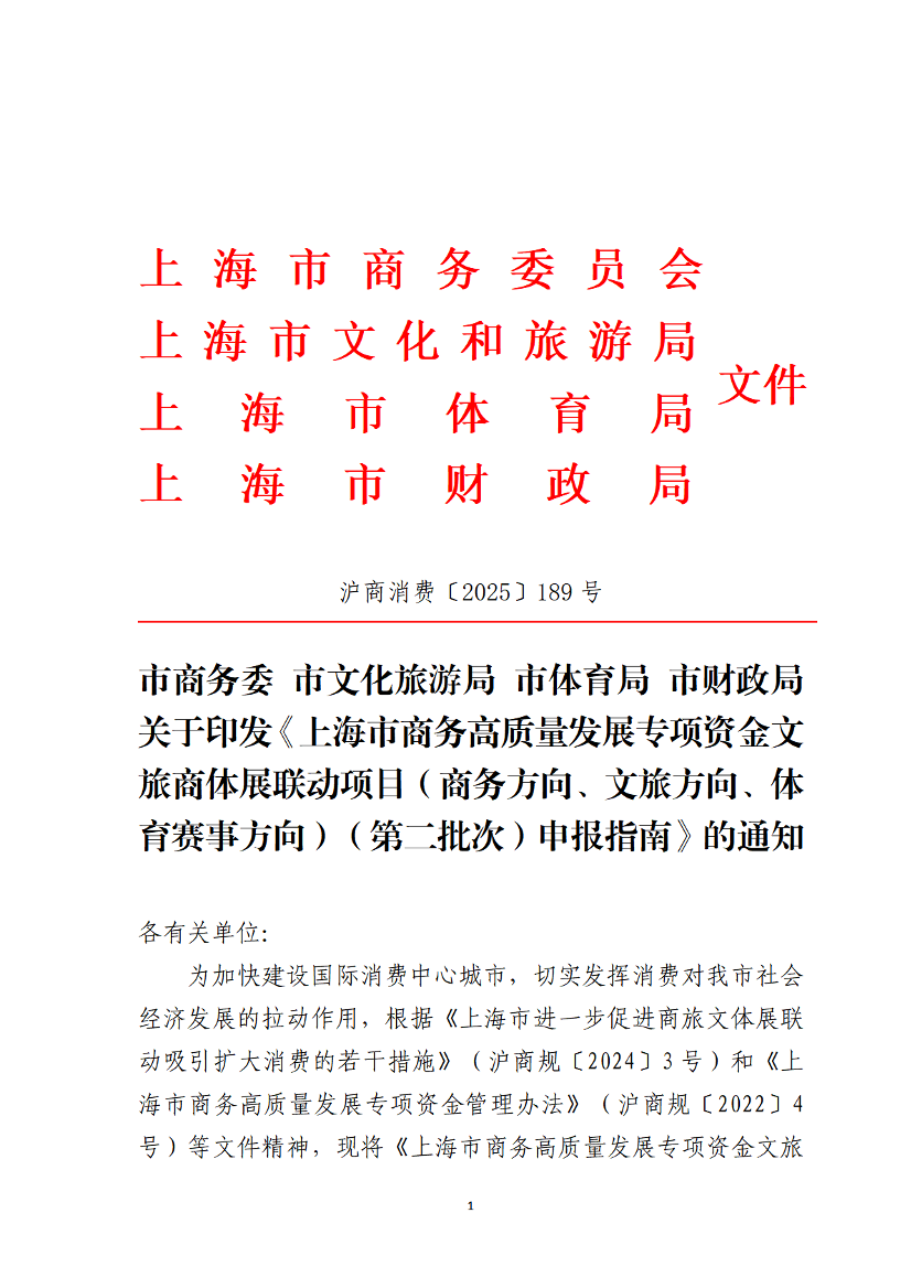 ??為加快建設(shè)國際消費(fèi)中心城市,切實(shí)發(fā)揮消費(fèi)對(duì)我市社會(huì)經(jīng)濟(jì)發(fā)展的拉動(dòng)作用,根據(jù)《上海市進(jìn)一步促進(jìn)商旅文體展聯(lián)動(dòng)吸引擴(kuò)大消費(fèi)的若干措施》(滬商規(guī)〔2024〕3號(hào))和《上海市商務(wù)高質(zhì)量發(fā)展專項(xiàng)資金管理辦法》(滬商規(guī)〔2022〕4號(hào))等文件精神,現(xiàn)將《上海市商務(wù)高質(zhì)量發(fā)展專項(xiàng)資金文旅商體展聯(lián)動(dòng)項(xiàng)目(商務(wù)方向、文旅方向、體育賽事方向)(第二批次)申報(bào)指南》印發(fā)給你們,請(qǐng)按照要求做好相關(guān)申報(bào)工作。