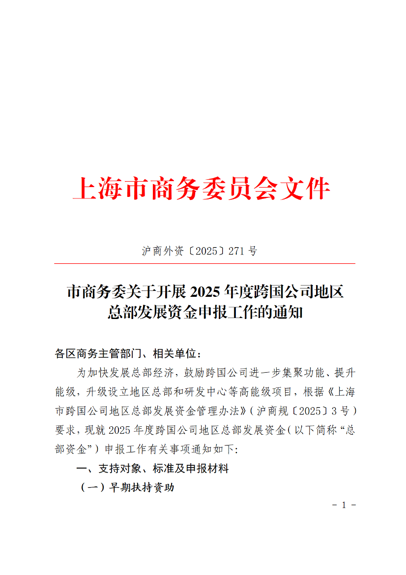 ??為加快發(fā)展總部經(jīng)濟,鼓勵跨國公司進(jìn)一步集聚功能、提升能級,升級設(shè)立地區(qū)總部和研發(fā)中心等高能級項目,根據(jù)《上海市跨國公司地區(qū)總部發(fā)展資金管理辦法》(滬商規(guī)〔2025〕3號)要求,現(xiàn)就2025年度跨國公司地區(qū)總部發(fā)展資金(以下簡稱“總部資金”)申報工作有關(guān)事項通知如下:
