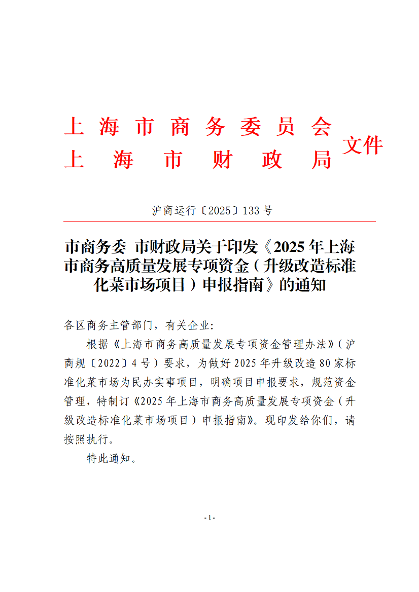 ??根據《上海市商務高質量發(fā)展專項資金管理辦法》(滬商規(guī)〔2022〕4號)要求,為做好2025年升級改造80家標準化菜市場為民辦實事項目,明確項目申報要求,規(guī)范資金管理,特制訂《2025年上海市商務高質量發(fā)展專項資金(升級改造標準化菜市場項目)申報指南》?,F(xiàn)印發(fā)給你們,請按照執(zhí)行。