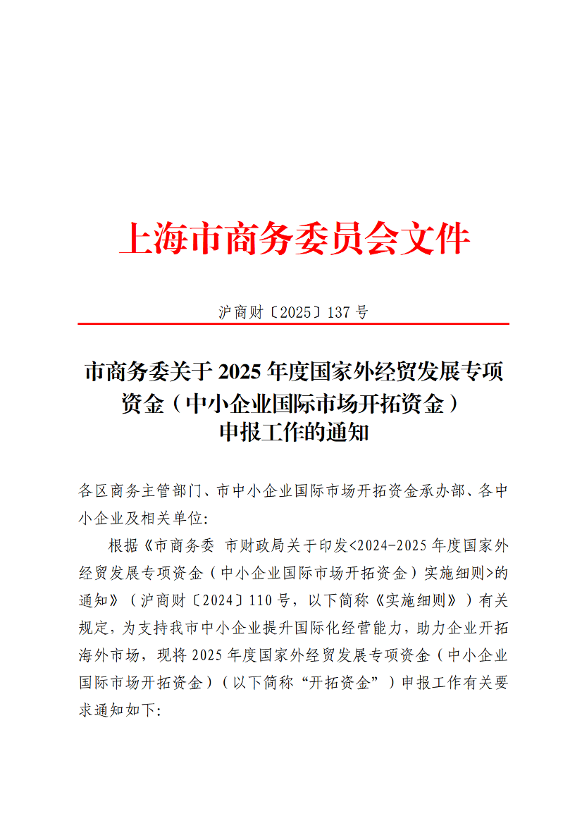 ??根據(jù)《市商務委 市財政局關(guān)于印發(fā)<2024-2025年度國家外經(jīng)貿(mào)發(fā)展專項資金(中小企業(yè)國際市場開拓資金)實施細則>的通知》(滬商財〔2024〕110號,以下簡稱《實施細則》)有關(guān)規(guī)定,為支持我市中小企業(yè)提升國際化經(jīng)營能力,助力企業(yè)開拓海外市場,現(xiàn)將2025年度國家外經(jīng)貿(mào)發(fā)展專項資金(中小企業(yè)國際市場開拓資金)(以下簡稱“開拓資金”)申報工作有關(guān)要求通知如下:
