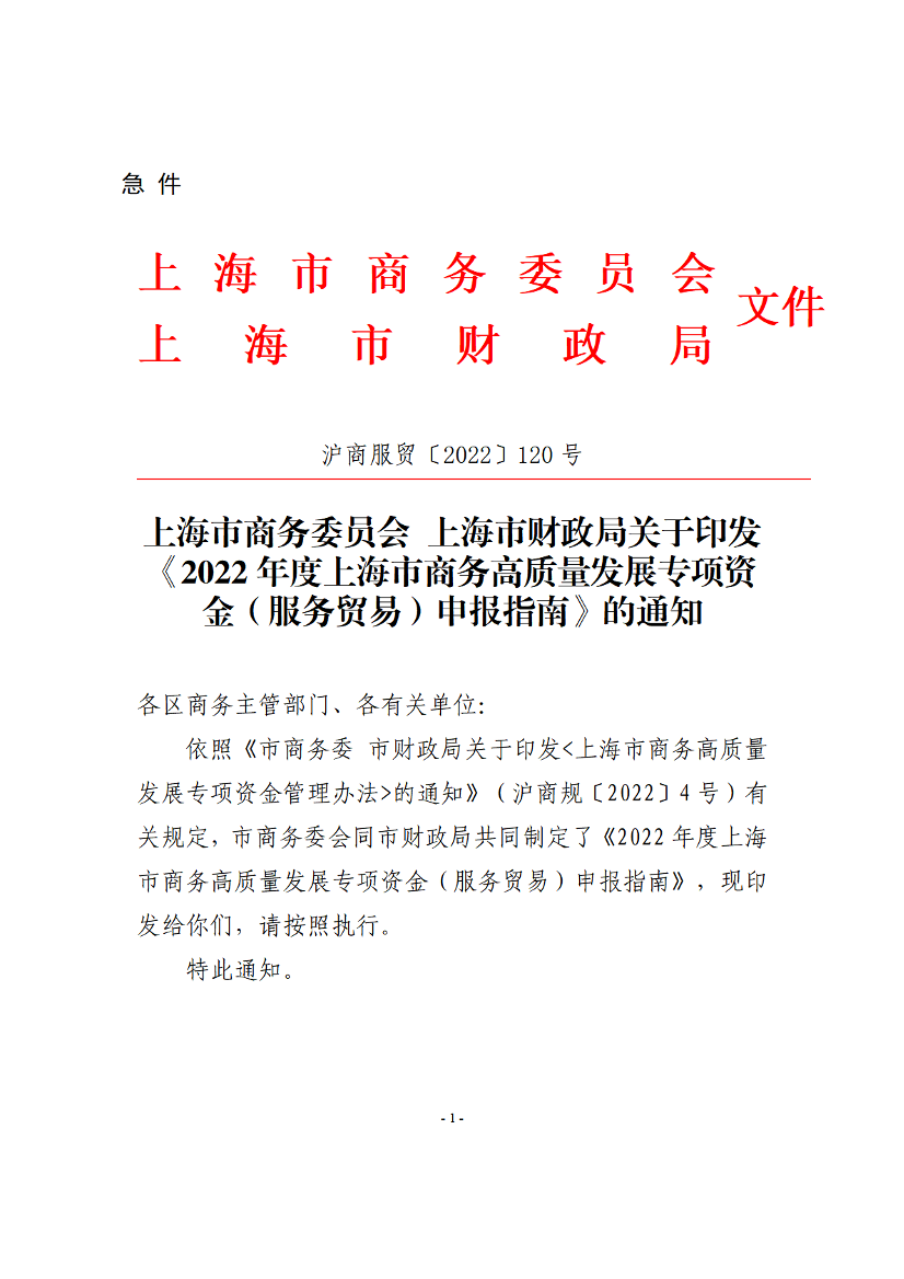 ??本指南自印發(fā)之日起施行,針對(duì)2022年度上海市商務(wù)高質(zhì)量發(fā)展專項(xiàng)資金(服務(wù)貿(mào)易)有效。