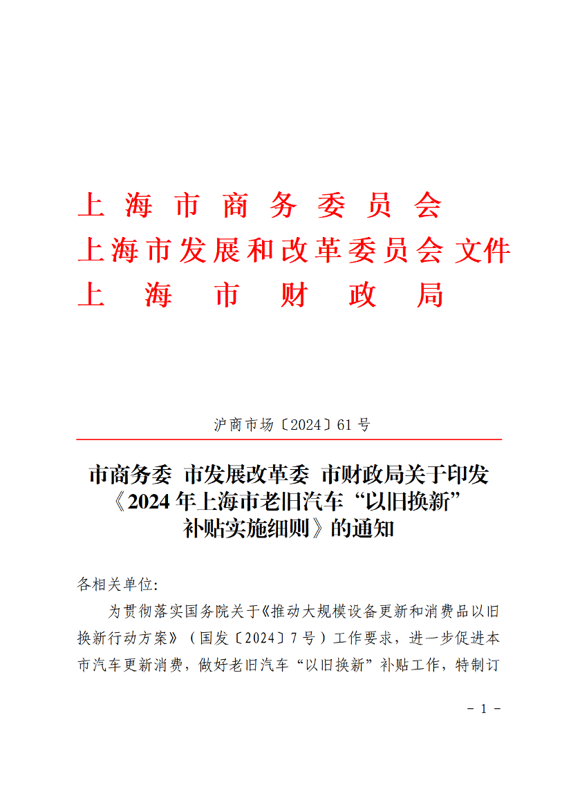 ??為貫徹落實國務院關于《推動大規(guī)模設備更新和消費品以舊換新行動方案》(國發(fā)〔2024〕7號)工作要求,進一步促進本市汽車更新消費,做好老舊汽車“以舊換新”補貼工作,特制訂《2024年上海市老舊汽車“以舊換新”補貼實施細則》,現(xiàn)予印發(fā),請遵照執(zhí)行。