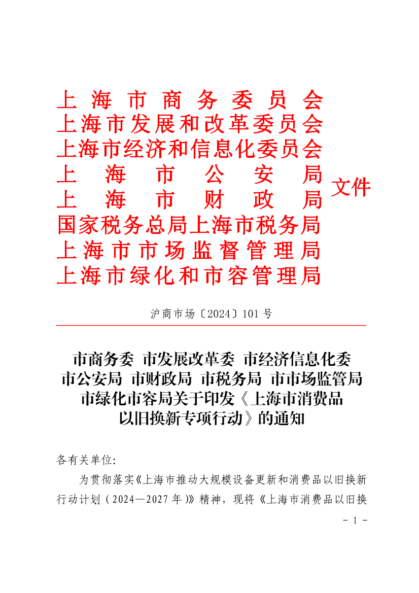 ??為貫徹落實(shí)《上海市推動(dòng)大規(guī)模設(shè)備更新和消費(fèi)品以舊換新行動(dòng)計(jì)劃(2024—2027年)》精神,現(xiàn)將《上海市消費(fèi)品以舊換新專項(xiàng)行動(dòng)》印發(fā)給你們,請(qǐng)遵照?qǐng)?zhí)行。