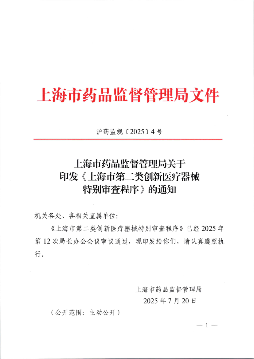 ??《上海市第二類創(chuàng)新醫(yī)療器械特別審查程序》已經(jīng)2025年第12次局長辦公會(huì)議審議通過,現(xiàn)印發(fā)給你們,請認(rèn)真遵照執(zhí)行。