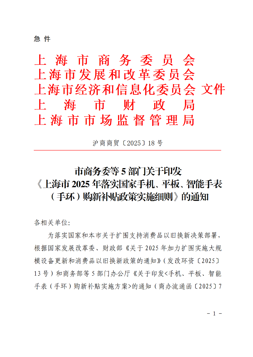 ??為落實(shí)國(guó)家和本市關(guān)于擴(kuò)圍支持消費(fèi)品以舊換新決策部署,根據(jù)國(guó)家發(fā)展改革委、財(cái)政部《關(guān)于2025年加力擴(kuò)圍實(shí)施大規(guī)模設(shè)備更新和消費(fèi)品以舊換新政策的通知》(發(fā)改環(huán)資〔2025〕13號(hào))和商務(wù)部等5部門辦公廳《關(guān)于印發(fā)<手機(jī)、平板、智能手表(手環(huán))購(gòu)新補(bǔ)貼實(shí)施方案>的通知(商辦流通函〔2025〕7號(hào))要求,現(xiàn)印發(fā)《上海市2025年落實(shí)國(guó)家手機(jī)、平板、智能手表(手環(huán))購(gòu)新補(bǔ)貼政策實(shí)施細(xì)則》,請(qǐng)認(rèn)真貫徹執(zhí)行。