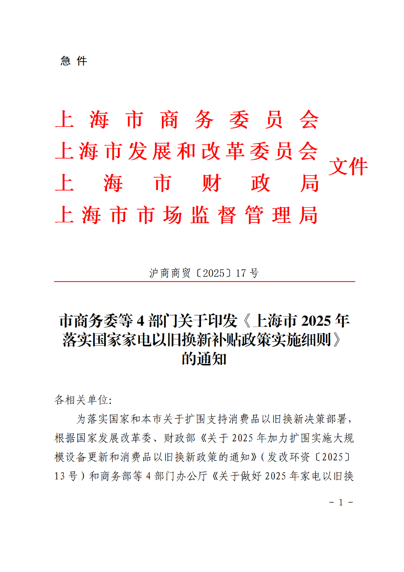 ??為落實國家和本市關(guān)于擴圍支持消費品以舊換新決策部署,根據(jù)國家發(fā)展改革委、財政部《關(guān)于2025年加力擴圍實施大規(guī)模設(shè)備更新和消費品以舊換新政策的通知》(發(fā)改環(huán)資〔2025〕13號)和商務部等4部門辦公廳《關(guān)于做好2025年家電以舊換新工作的通知》(商辦流通函〔2025〕6號)要求,現(xiàn)印發(fā)《上海市2025年落實國家家電以舊換新補貼政策實施細則》,請認真貫徹執(zhí)行。