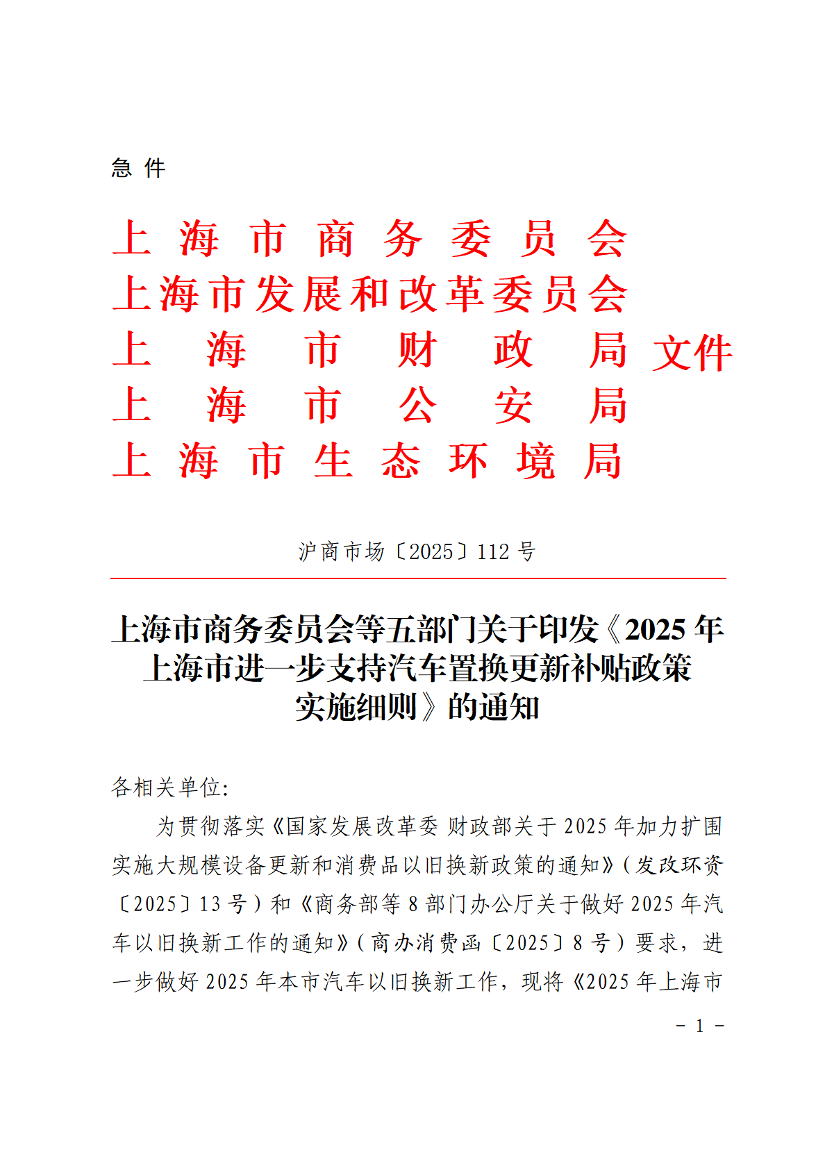 ??為貫徹落實《國家發(fā)展改革委 財政部關(guān)于2025年加力擴圍實施大規(guī)模設(shè)備更新和消費品以舊換新政策的通知》(發(fā)改環(huán)資〔2025〕13號)和《商務(wù)部等8部門辦公廳關(guān)于做好2025年汽車以舊換新工作的通知》(商辦消費函〔2025〕8號)要求,進一步做好2025年本市汽車以舊換新工作,現(xiàn)將《2025年上海市進一步支持汽車置換更新補貼政策實施細則》印發(fā)給你們,請認真按照執(zhí)行。