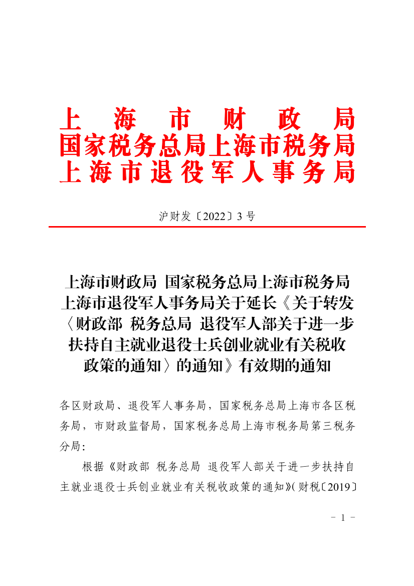 ??根據(jù)《財政部稅務總局退役軍人部關于進一步扶持自主就業(yè)退役士兵創(chuàng)業(yè)就業(yè)有關稅收政策的通知》(財稅〔2019〕21號)和《財政部稅務總局關于延長部分稅收優(yōu)惠政策執(zhí)行期限的公告》(2022年第4號公告)相關規(guī)定,經(jīng)評估并報經(jīng)市政府同意,《上海市財政局國家稅務總局上海市稅務局上海市退役軍人事務局關于轉發(fā)〈財政部稅務總局退役軍人部關于進一步扶持自主就業(yè)退役士兵創(chuàng)業(yè)就業(yè)有關稅收政策的通知〉的通知》(滬財發(fā)〔2019〕2號)需繼續(xù)實施,有效期延長至2023年12月31日,文中規(guī)定的稅收政策執(zhí)行期限相應延長至2023年12月31日。