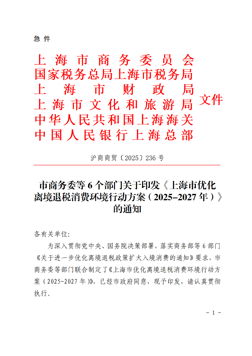 ??為深入貫徹黨中央、國務(wù)院決策部署,落實商務(wù)部等6部門《關(guān)于進(jìn)一步優(yōu)化離境退稅政策擴(kuò)大入境消費的通知》要求,市商務(wù)委等部門聯(lián)合制定了《上海市優(yōu)化離境退稅消費環(huán)境行動方案(2025-2027年)》,已經(jīng)市政府同意,現(xiàn)予印發(fā),請認(rèn)真貫徹執(zhí)行。