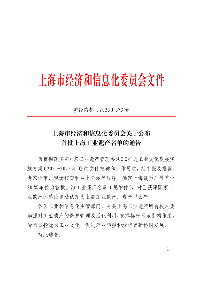 ??為貫徹落實《國家工業(yè)遺產管理辦法》《推進工業(yè)文化發(fā)展實施方案(2021-2025年)》的文件精神和工作要求,經申報及推薦、專家評審、現(xiàn)場核查和網上公示等程序,確定上海造幣廠等單位20家單位為首批上海工業(yè)遺產名單(見附件),對已獲評國家工業(yè)遺產的單位自動認定為上海工業(yè)遺產?,F(xiàn)予以公布。