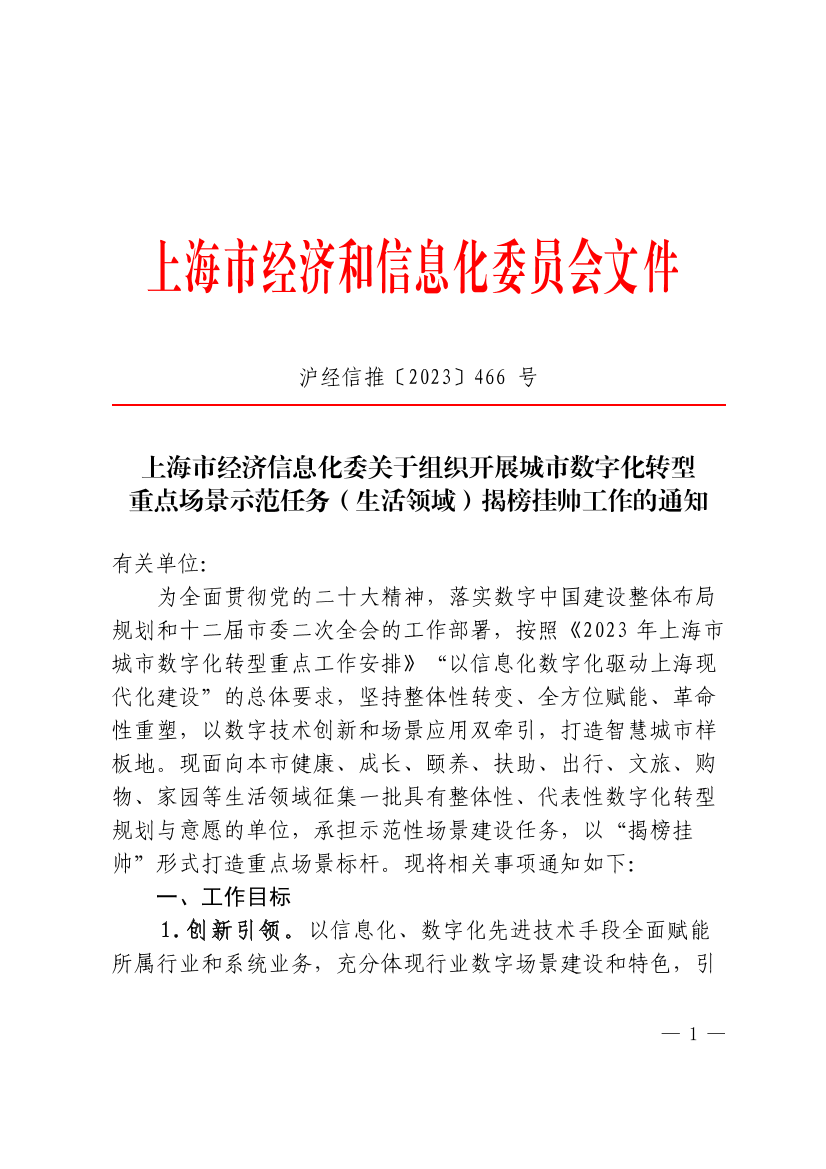 ??為全面貫徹黨的二十大精神,落實數(shù)字中國建設整體布局規(guī)劃和十二屆市委二次全會的工作部署,按照《2023年上海市城市數(shù)字化轉型重點工作安排》“以信息化數(shù)字化驅動上?,F(xiàn)代化建設”的總體要求,堅持整體性轉變、全方位賦能、革命性重塑,以數(shù)字技術創(chuàng)新和場景應用雙牽引,打造智慧城市樣板地。現(xiàn)面向本市健康、成長、頤養(yǎng)、扶助、出行、文旅、購物、家園等生活領域征集一批具有整體性、代表性數(shù)字化轉型規(guī)劃與意愿的單位,承擔示范性場景建設任務,以“揭榜掛帥”形式打造重點場景標桿。現(xiàn)將相關事項通知如下: