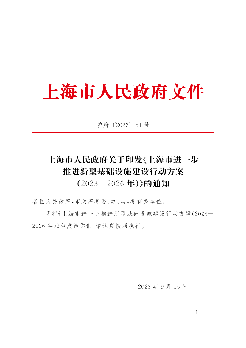 ??現(xiàn)將《上海市進(jìn)一步推進(jìn)新型基礎(chǔ)設(shè)施建設(shè)行動(dòng)方案(2023-2026年)》印發(fā)給你們,請認(rèn)真按照執(zhí)行。